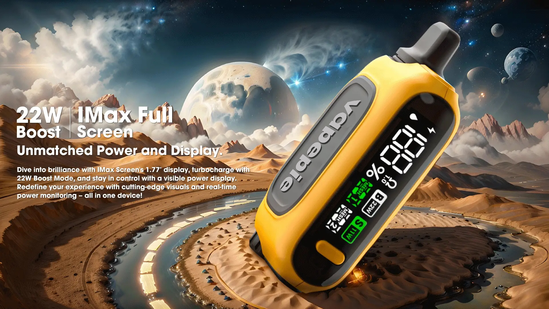 Neprekonateľný výkon a zobrazenie. Ponorte sa do brilantného vizuálneho zážitku s 1,77" displejom iMax, turbo nabíjanie v 22W Boost režime a kontrola energie v reálnom čase. Predefinujte svoj vapovací zážitok s pokročilými vizuálmi a monitorovaním výkonu – všetko v jednom zariadení!